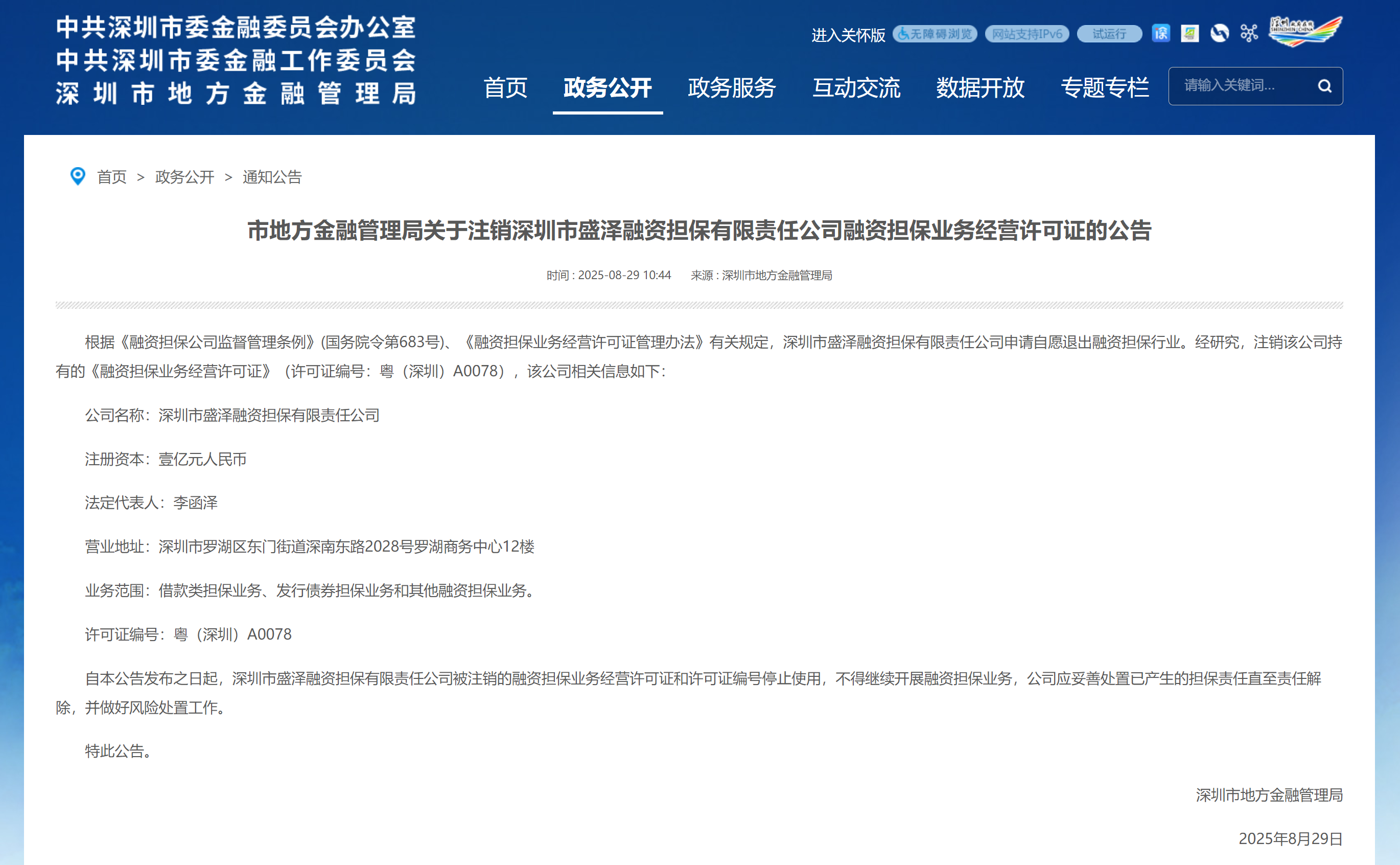 市地方金融管理局关于注销深圳市盛泽融资担保有限责任公司融资担保业务经营许可证的公告