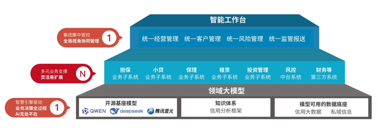 中证信用“智慧金控平台”基于“集团集中管控、多元业务支撑、智慧引擎驱动”的“1+N+1”创新框架,实现AI模型、数据、知识体系、技术工具等核心能力的沉淀和持续扩展,并将AI赋能、智慧驱动深度融入集团管控和多元业务场景,助力地方金控集团数字化转型、全面拥抱AI智能时代。