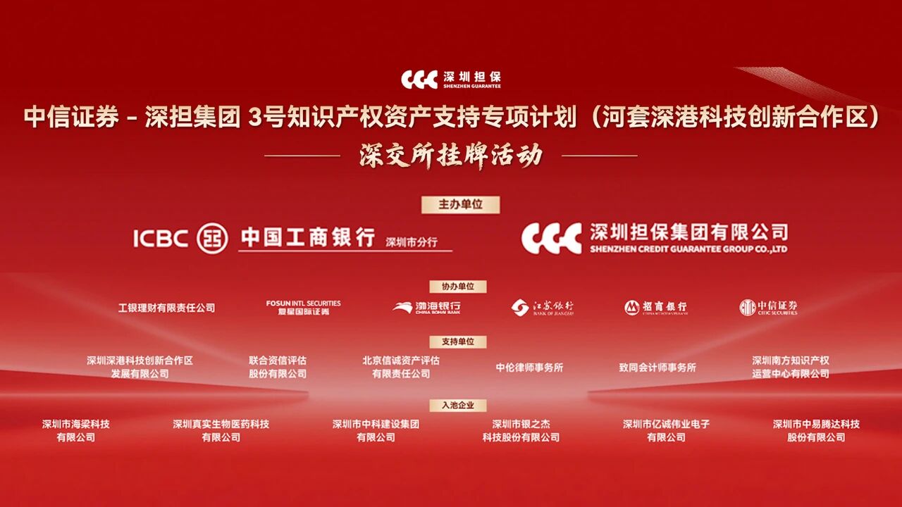 为深入贯彻落实国务院《河套深港科技创新合作区深圳园区发展规划》、深圳市市场监督管理局等10部门《关于加强河套深港科技创新合作区深圳园区知识产权保护和运用的意见》,进一步强化深港金融与产业联动,10月24日,在深圳市市场监督管理局(深圳市知识产权局)、深圳市福田区人民政府的指导下,在深圳深港科技创新合作区发展有限公司的支持下,由深圳担保集团有限公司与中国工商银行深圳市分行联合发起的“中信证券-深担集团-3号知识产权资产支持专项计划(河套深港科技创新合作区)”在深交所正式挂牌。本期产品发行规模4200万元,在全国范围内首次实现“知识产权跨境质押+深港资金跨境认购”的知识产权证券化“双跨境”创新,标志着深圳在知识产权金融创新与深港协同合作领域取得新突破。