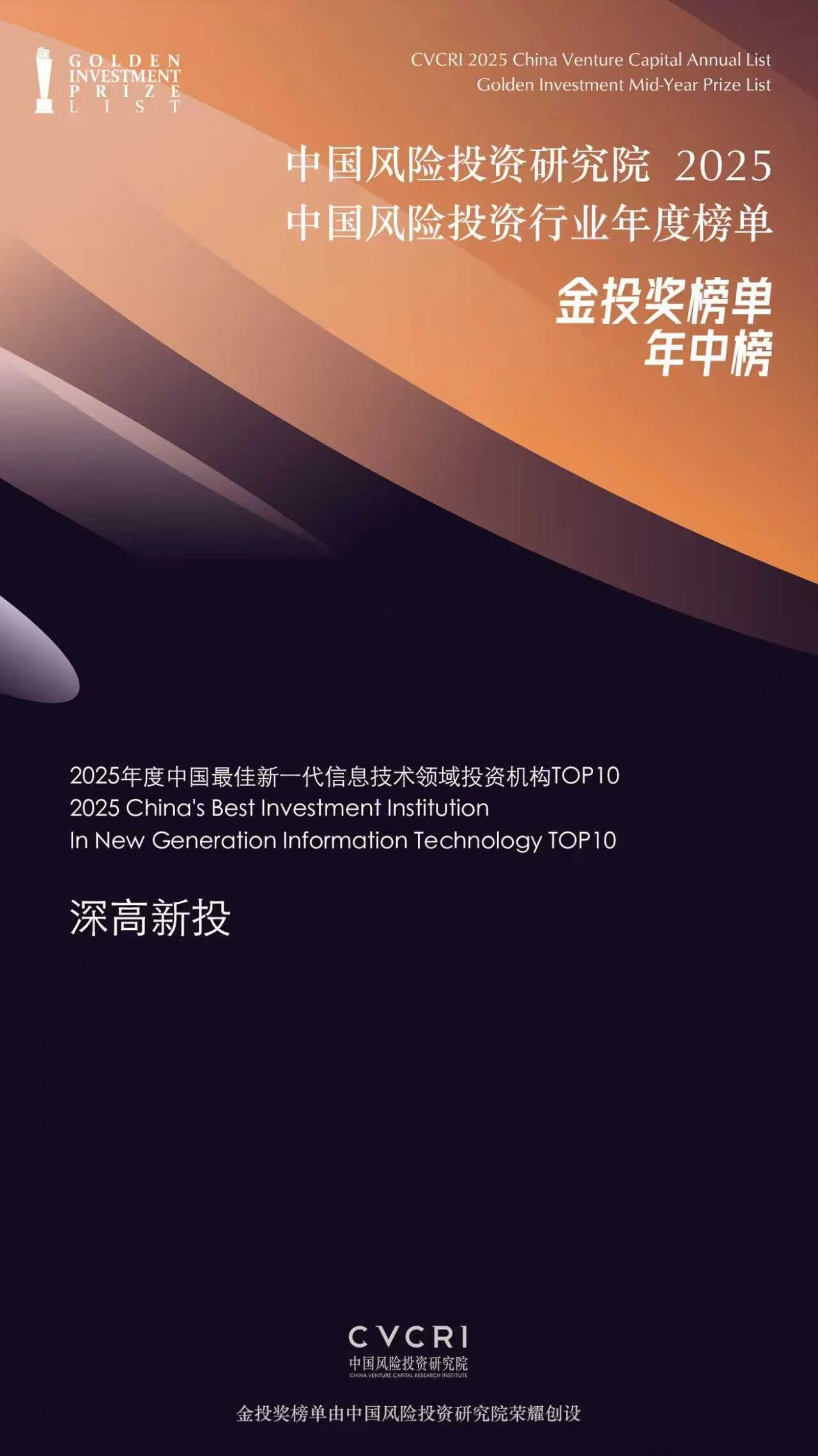 近日,中国风险投资研究院揭晓“2025中国风险投资行业年度榜单·金投奖·年中榜”。凭借在创投领域的卓越表现,深高新投斩获“2025年度中国影响力投资机构TOP100(第25名)”“ 2025年度中国影响力国资投资机构TOP50”和“2025年度中国最佳新一代信息技术领域投资机构TOP10”三项大奖。这也是深高新投连续第八年荣获“金投奖年度中国影响力投资机构”奖项。
