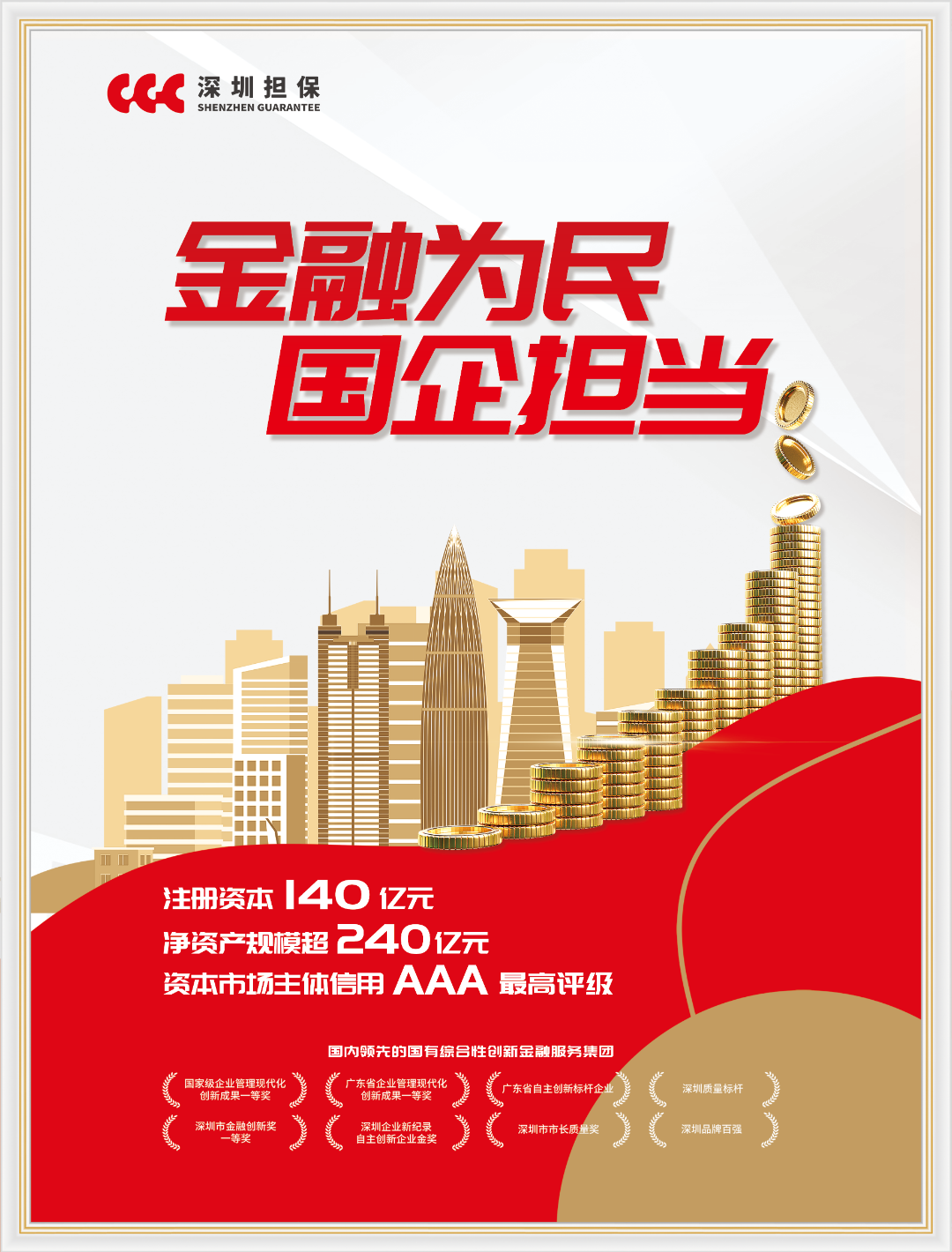 深圳担保集团有限公司(简称深担集团)成立于1999年,现注册资本140亿元,净资产超240亿元,资本市场主体信用AAA 最高评级,目前已成为国内领先的国有综合性创新金融服务集团。集团业务范围覆盖融资担保、债券增信、创业投资、工程保函、小额贷款、商业保理等,致力为各类型企业提供提供“一站式、全周期、多维度”综合创新金融服务解决方案。截至目前,已累计为超15.6万家次企业提供投融资服务近1.3万亿元,近三年年均业务发生额超1400亿元,成功助推322家企业客户在国内外挂牌上市。