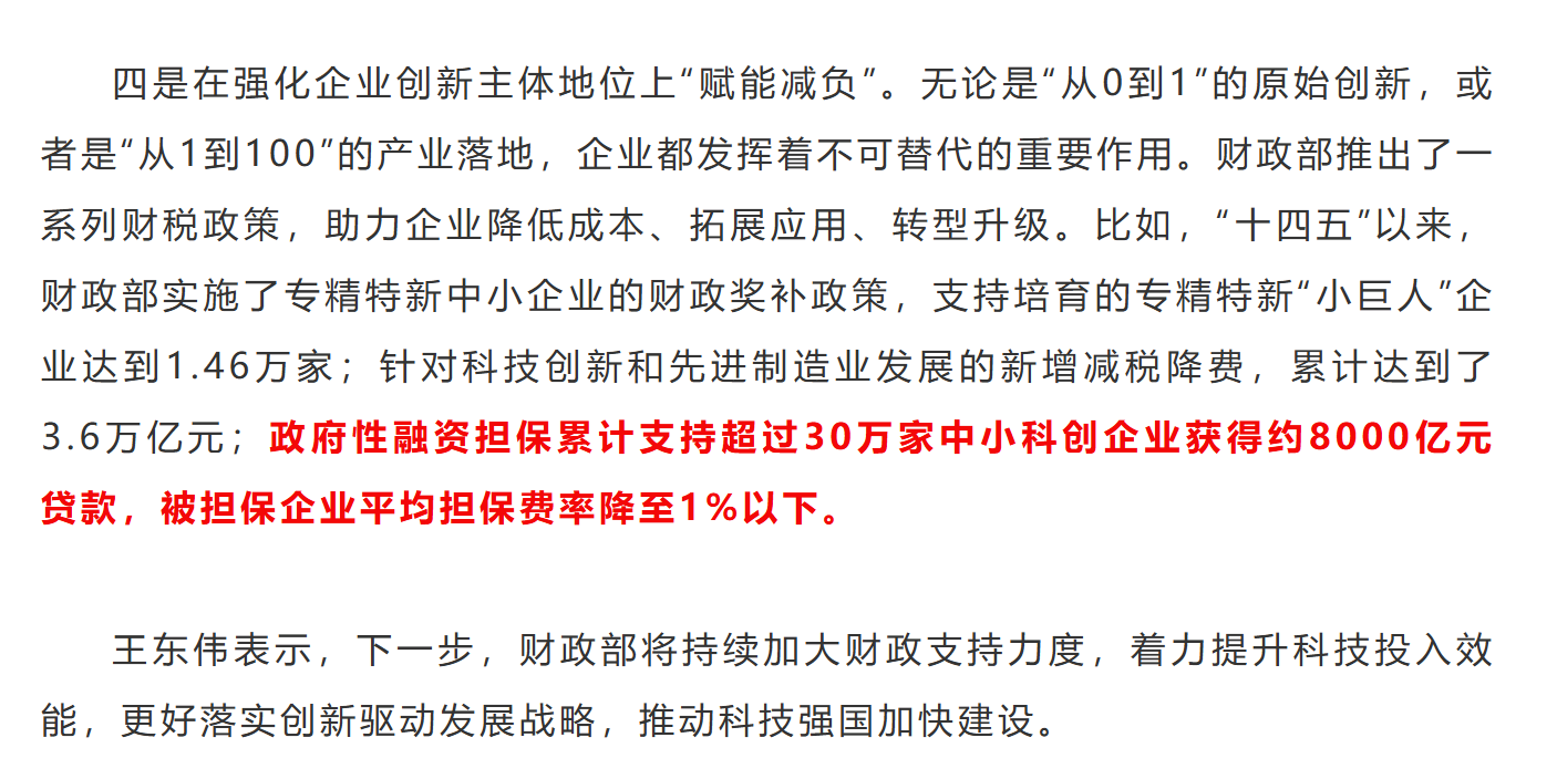 财政部:“十四五”以来政府性融资担保支持超30万家中小科创企业获得约8000亿元贷款
